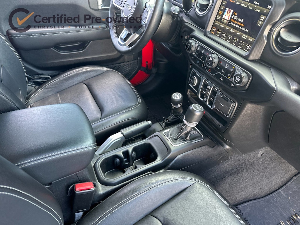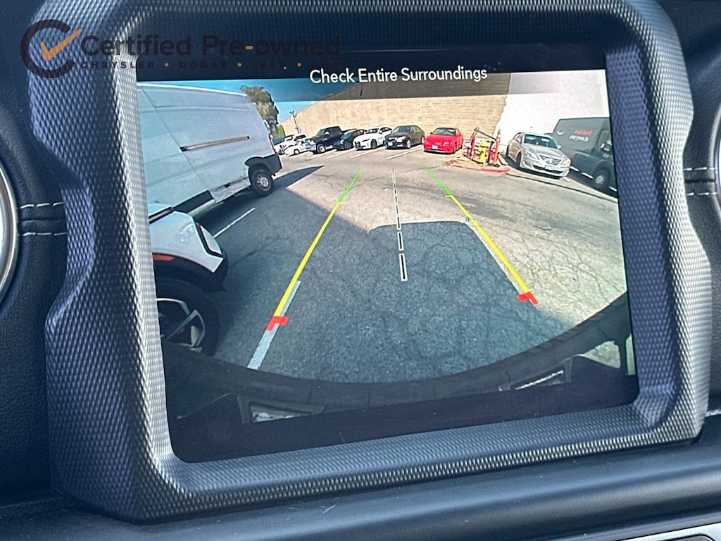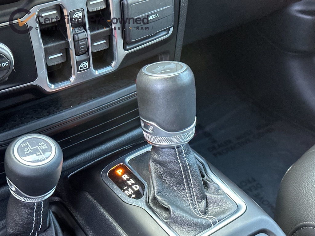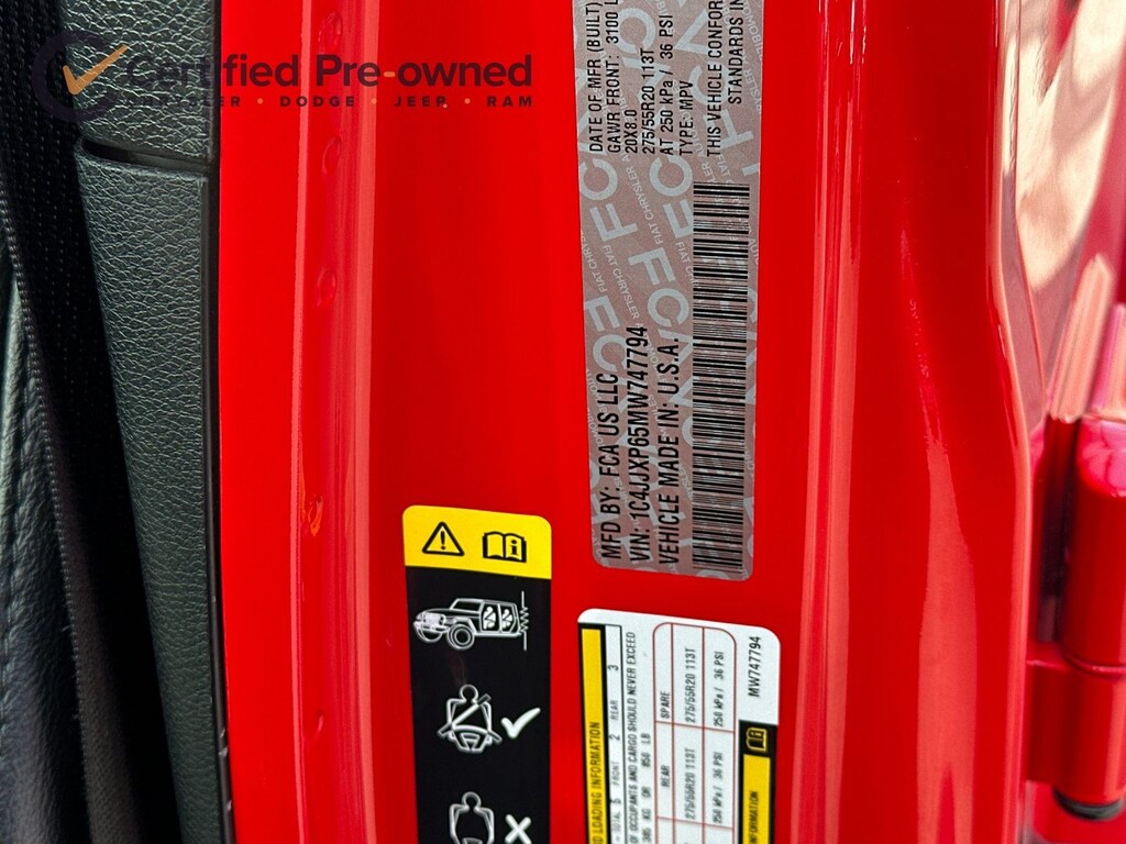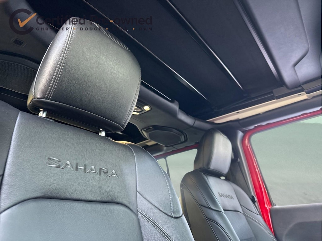 2.0L I4 DOHC, ABS brakes, Alloy wheels, Apple CarPlay/Android Auto, Brake assist, Cold Weather Group, Compass, Delay-off headlights, Electronic Stability Control, Emergency communication system: SiriusXM Guardian, Front Bucket Seats, Front dual zone A/C, Fully automatic headlights, Heated Front Seats, Heated Steering Wheel, Illuminated entry, Leather Shift Knob, Leather steering wheel, Leather Trimmed Seats w/Sahara Logo, Leather Wrapped Park Brake Handle, Low tire pressure warning, Navigation System, Panic alarm, ParkView Rear Back-Up Camera, Passenger door bin, Power Top Quarter Window Storage Bag, Premium Black Sunrider Soft Top w/Dual Top Group, Remote keyless entry, Remote Proximity Keyless Entry, Remote Start System, Removable Rear Quarter Windows, Security system, Sky 1-Touch Power Top, Speed control, Sport Suspension, Traction control, Wheels: 20" x 8" Fully Painted Aluminum.