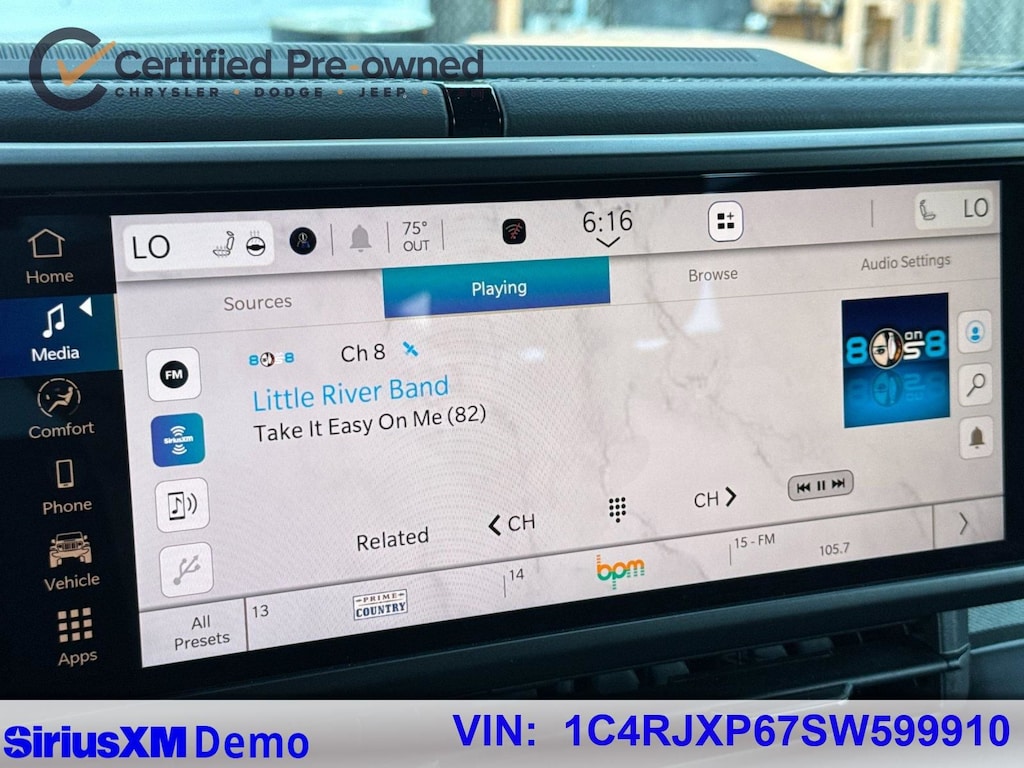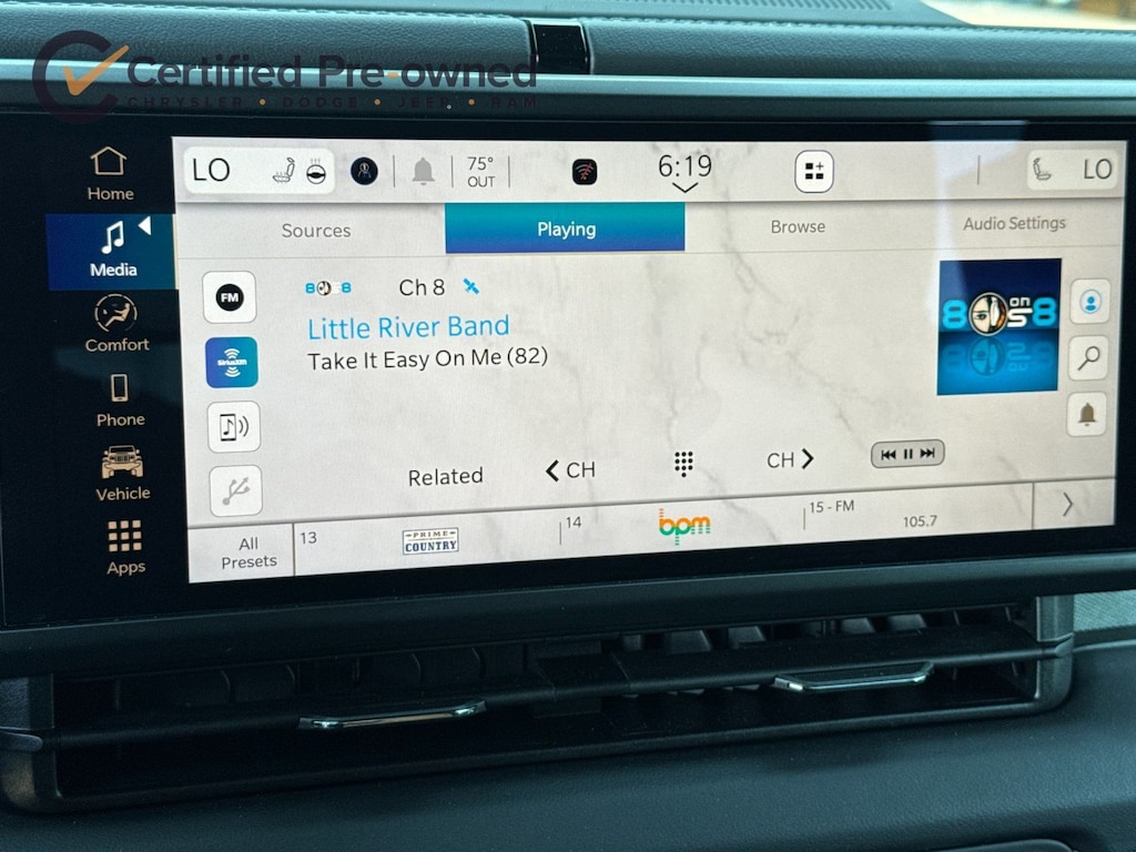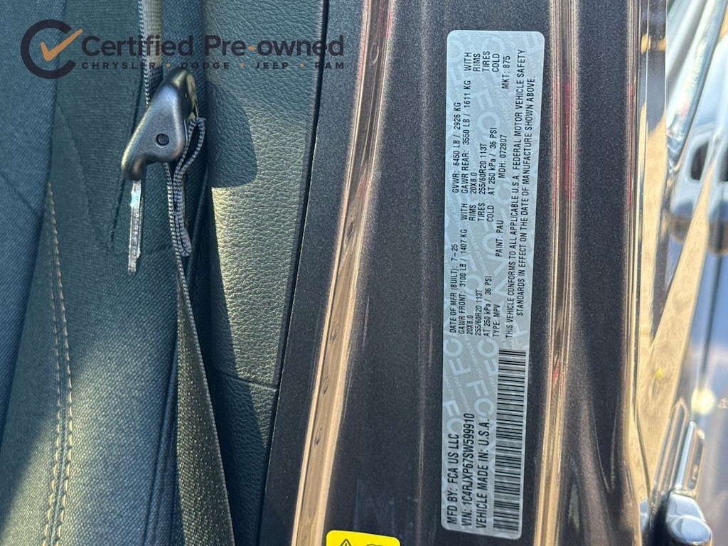 * Vehicles Up to 75,000 Miles and/or 5 Model Years. 24-Hour Towing & Roadside Assistance, Car Rental Allowance, CARFAX® Vehicle History ReportTM and an Introductory 3-month Subscription to SiriusXM® Satellite Radio & Certified Warranty Upgrades (for FCA US LLC Certified Pre-Owned program), Vehicles Between 6-10 Model Years and/or 75,001-120,000 Miles. Thorough Reconditioning Process Using Authentic Mopar Parts. 3-Month Trial Subscription for SiriusXM GuardianTM and Satellite Radio (for Certified Pre-Owned Go program), Vehicles Between 0-5 Model Years and/or 75,000 Miles. Thorough Reconditioning Process Using Authentic Mopar Parts. 12 Month/12,000 Mile Extended Care Premium Warranty, Car Rental Allowance, 3-Month Trial Subscription for SiriusXM GuardianTM and Satellite Radio (for Certified Pre-Owned Gold program)